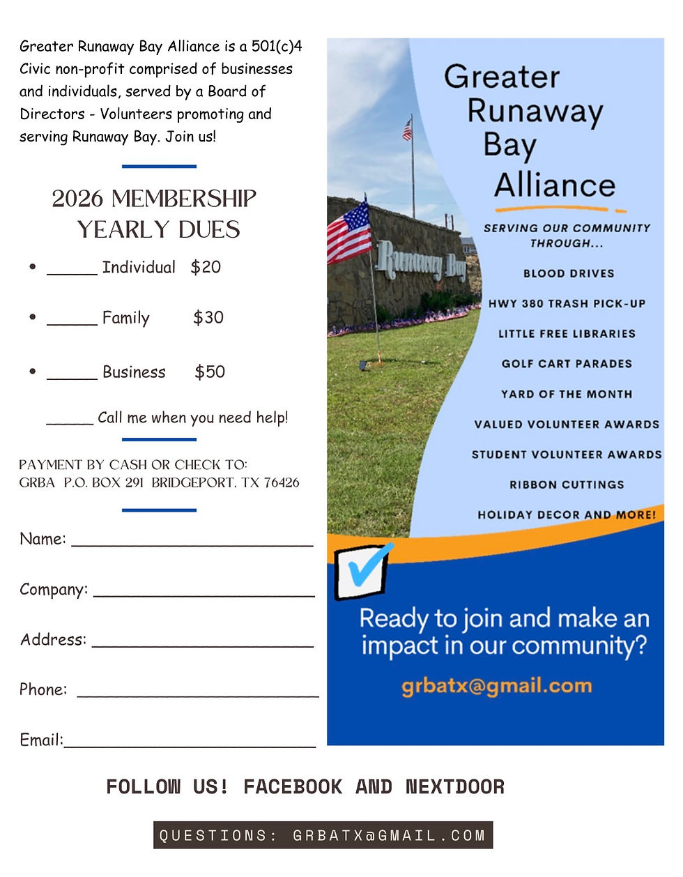 These events are made possible through volunteers and community support. Whether you’re donating your time, nominating a neighbor, or attending an event your involvement helps strengthen Runaway Bay.